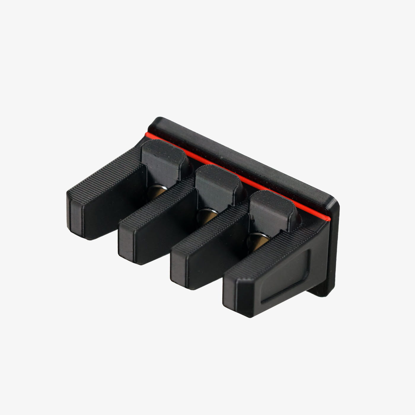 Uchwyty do magazynków Holdmymag charakteryzują się modułową konstrukcją. Składa się z listwy montażowej oraz mocowań dedykowanych do konkretnych typów magazynków. Każde mocowanie ma indywidualne magnesy nośne (neodymowe), co za tym idzie siła docisku do ściany szafy jest zawsze optymalna do ilości powieszonych magazynków.