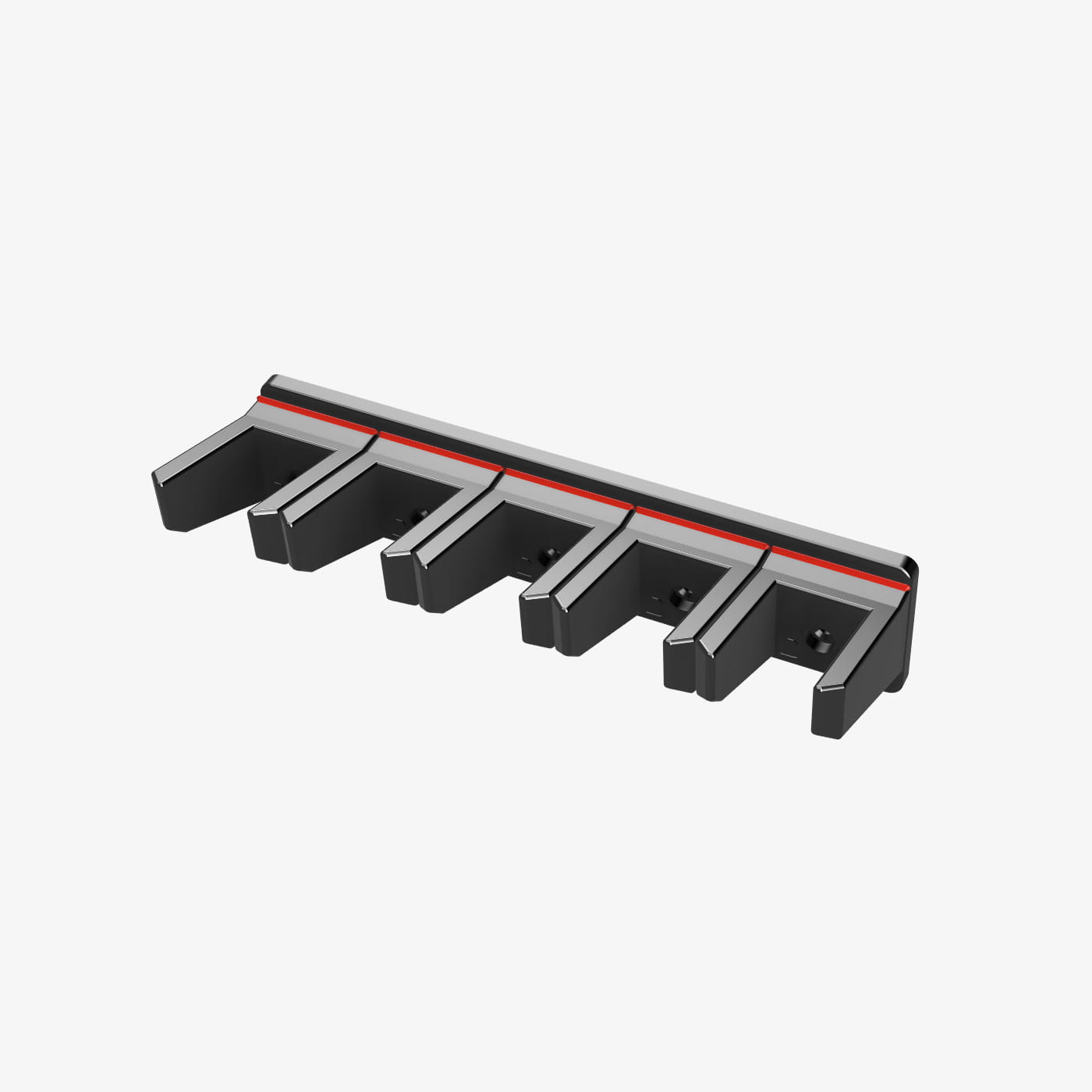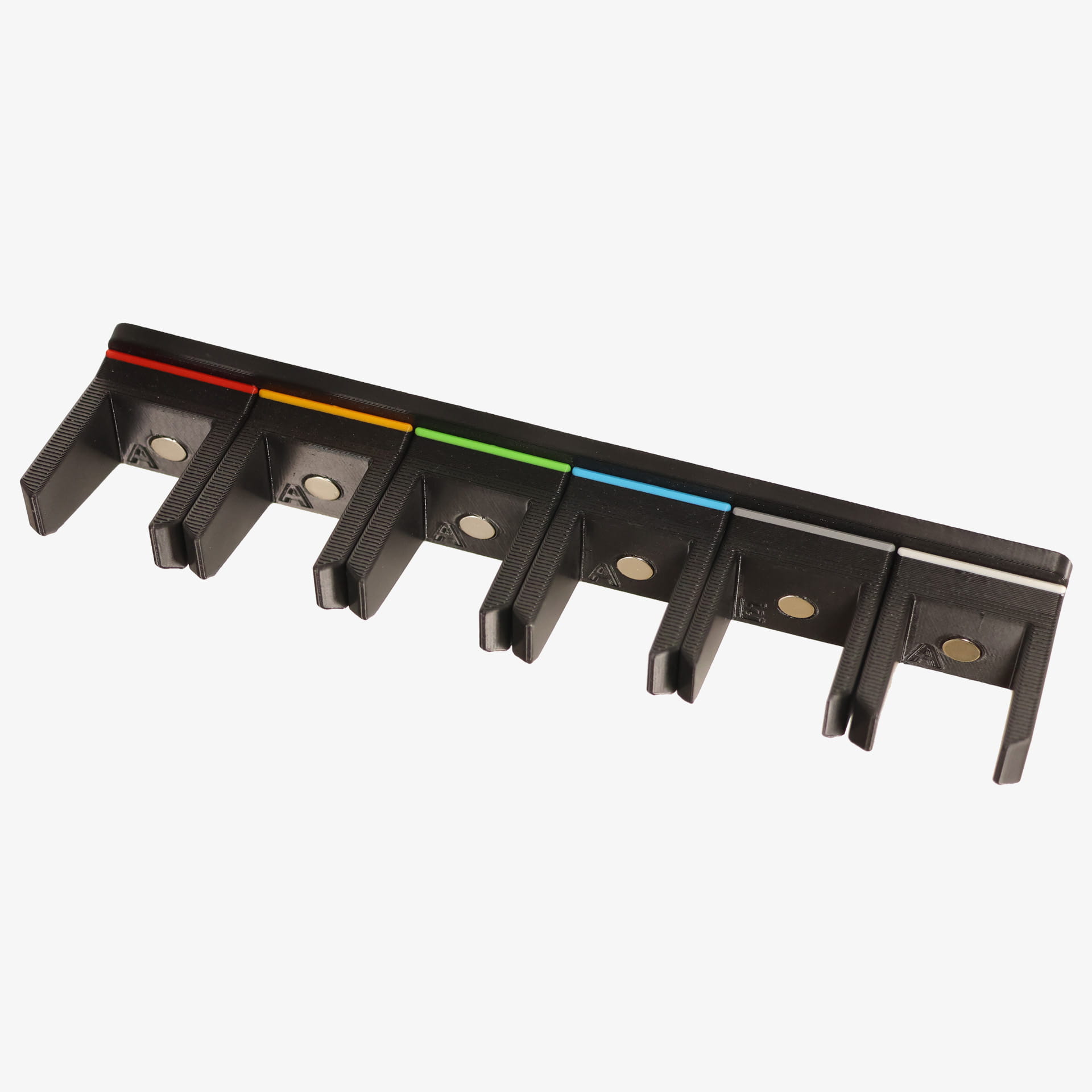 Uchwyty do magazynków Holdmymag charakteryzują się modułową konstrukcją. Składa się z listwy montażowej oraz mocowań dedykowanych do konkretnych typów magazynków. Każde mocowanie ma indywidualny magnes nośny (neodymowy), co za tym idzie siła docisku do ściany szafy jest zawsze optymalna do ilości powieszonych magazynków.