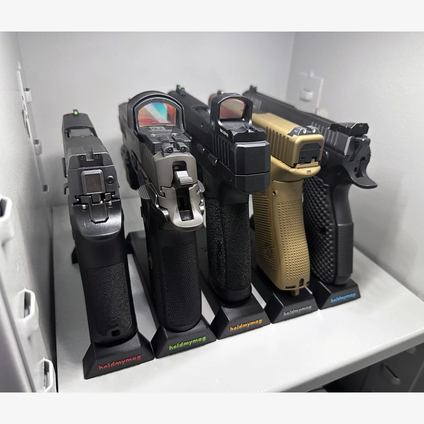 Uchwyt umożliwia przechowywanie pistoletu na płaskiej powierzchni, np. półkach szafy pancernej. Wyposażony jest w silne magnesy neodymowe oraz nogi stabilizacyjne (2 rodzaje w komplecie). Konstrukcja uchwytu zapewnia stabilne przechowywanie pistoletu oraz efektywne wykorzystanie przestrzeni. Uchwyt występuje w sześciu wariantach akcentu kolorystycznego.