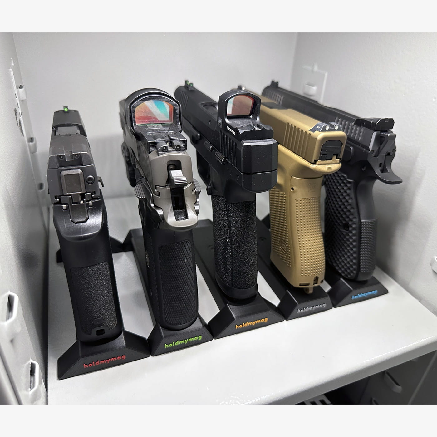 Uchwyt umożliwia przechowywanie pistoletu na płaskiej powierzchni, np. półkach szafy pancernej. Wyposażony jest w silne magnesy neodymowe oraz nogi stabilizacyjne (2 rodzaje w komplecie). Konstrukcja uchwytu zapewnia stabilne przechowywanie pistoletu oraz efektywne wykorzystanie przestrzeni. Uchwyt występuje w sześciu wariantach akcentu kolorystycznego.