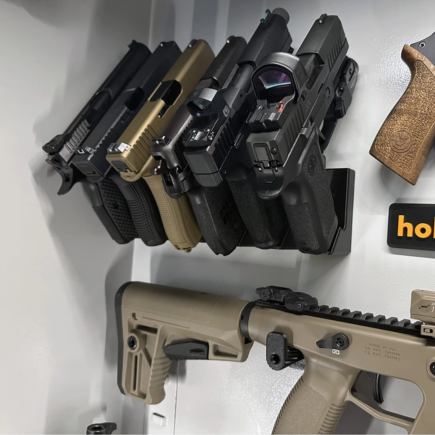 Uchwyt umożliwia przechowywanie pistoletu w pozycji prostopadłej do ściany szafy pancernej. Wyposażony jest w silne magnesy neodymowe. Jego konstrukcja zapewnia stabilne przechowywanie pistoletu oraz efektywne wykorzystanie przestrzeni. Uchwyt występuje w sześciu wariantach akcentu kolorystycznego.