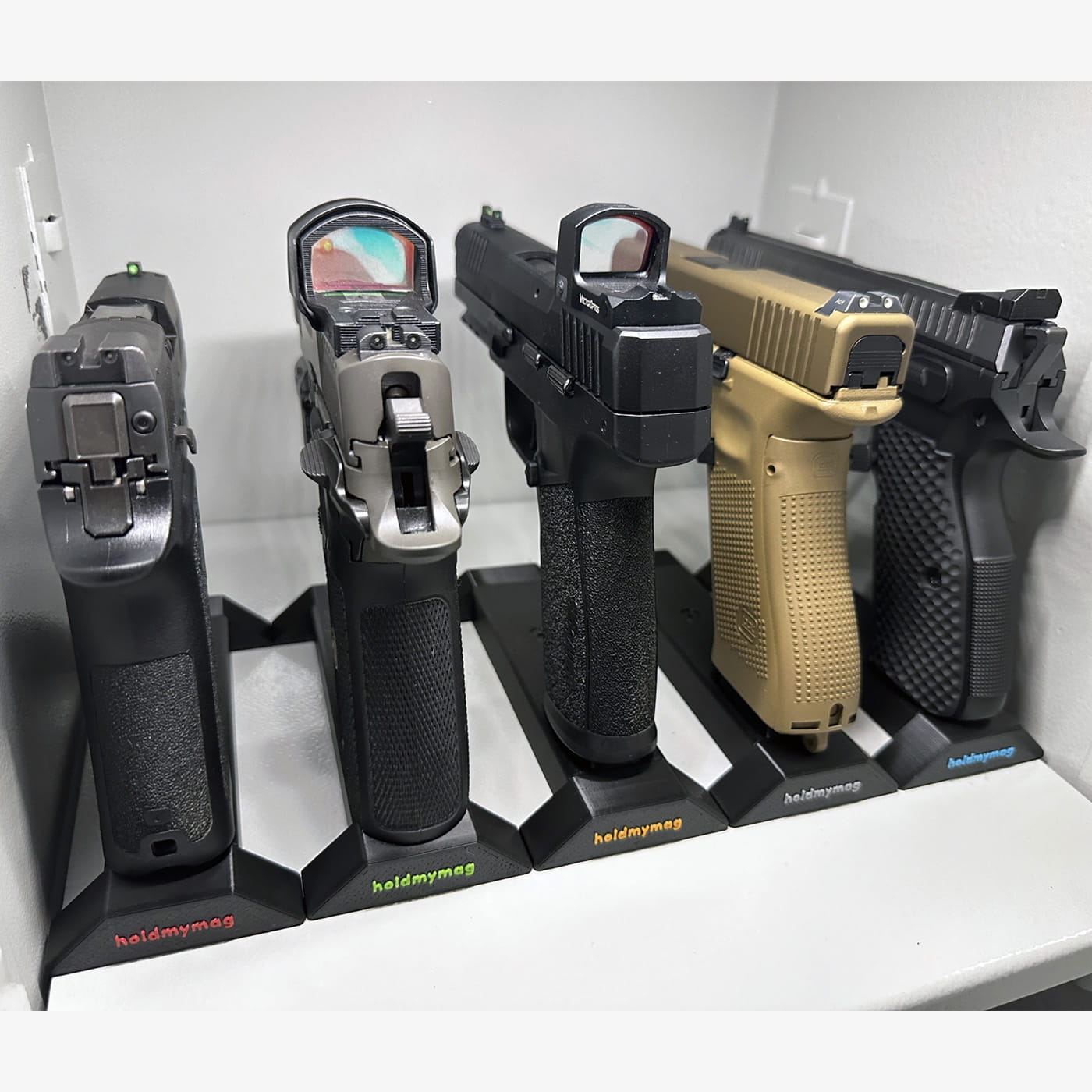 Uchwyt umożliwia przechowywanie pistoletu na płaskiej powierzchni, np. półkach szafy pancernej. Wyposażony jest w silne magnesy neodymowe oraz nogi stabilizacyjne (2 rodzaje w komplecie). Konstrukcja uchwytu zapewnia stabilne przechowywanie pistoletu oraz efektywne wykorzystanie przestrzeni. Uchwyt występuje w sześciu wariantach akcentu kolorystycznego.